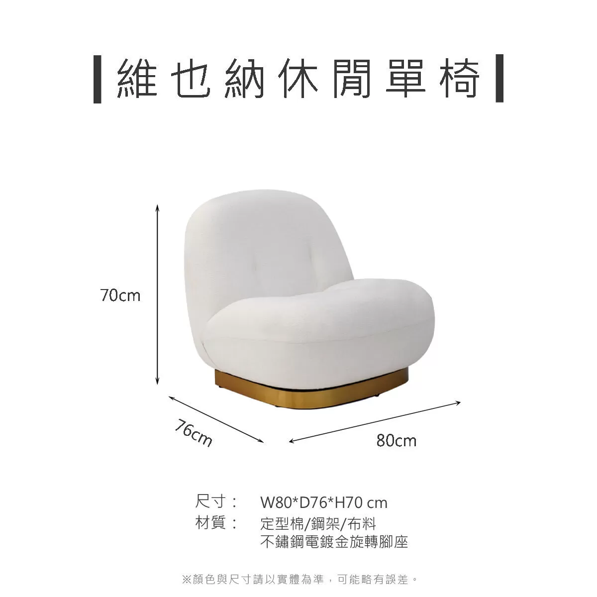 材質:定型棉/鋼架/布料、不鏽鋼電鍍金旋轉腳座